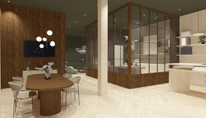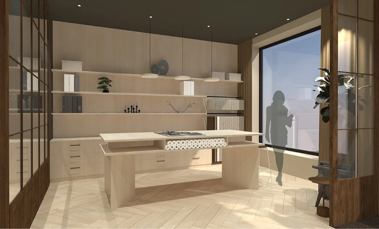 The material room serves as the heart of creativity in the studio, where designers can explore textures, colours, and finishes. This space is designed to be both practical and inspiring, featuring storage, a large worktable, and easy access to samples and tools. With open shelving and display areas, materials are showcased in a way that encourages experimentation and innovation. The work space is versatile, allowing for everything from hands-on prototyping to brainstorming sessions.