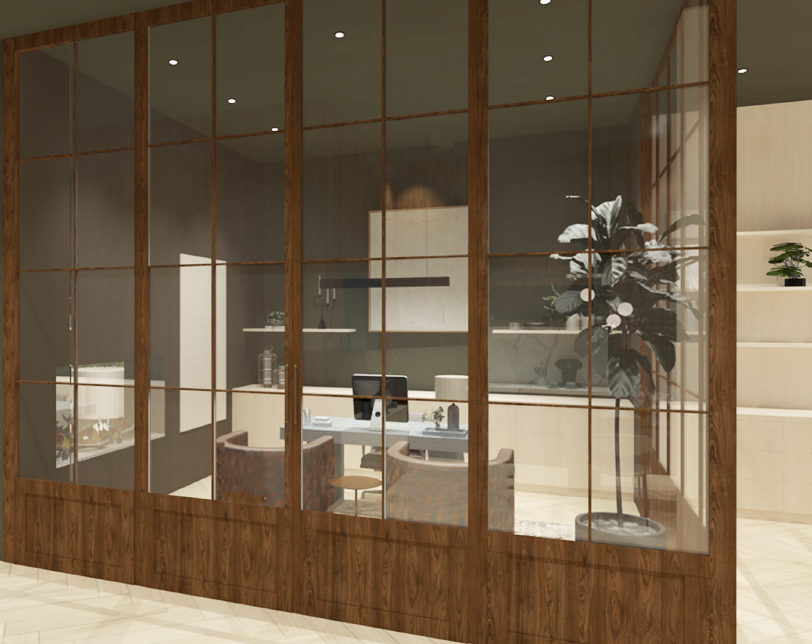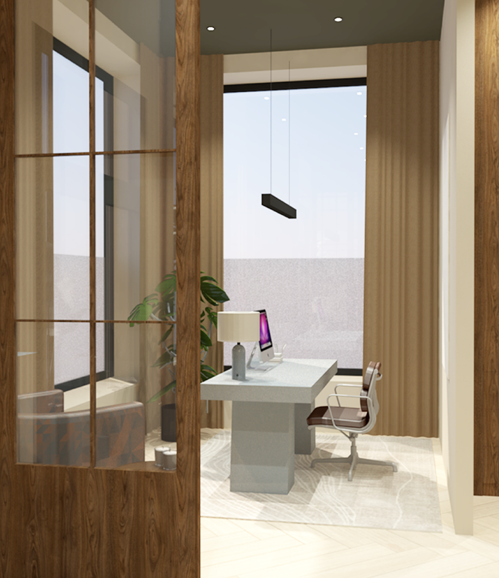This design studio office aims to create an inspiring and functional workspace that reflects the creative identity of an interior designer. The layout blends private offices for focused work with open, inviting areas for collaboration and client meetings.