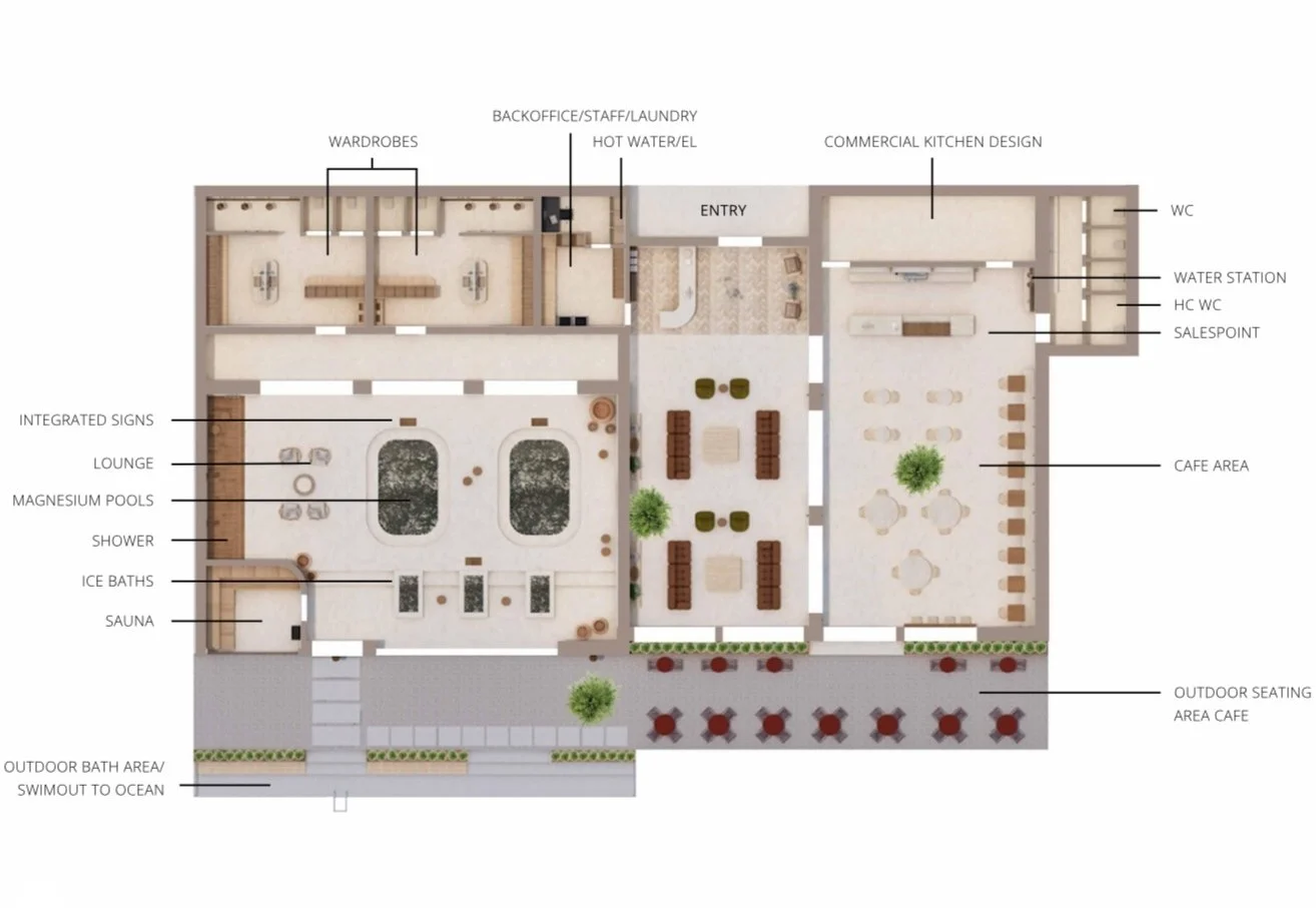 The layout is designed to flow naturally, guiding visitors through a sequence of experiences that promote relaxation and social interaction. Communal areas like the lounge and café are strategically placed to encourage conversation and connection. The open design and use of natural light ensure a seamless transition between indoor and outdoor areas, enhancing the overall sense of calm and immersion in nature.
